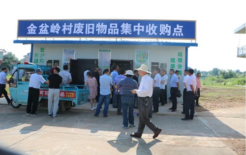 实践团在汉寿县城乡垃圾一体化办公室罗书记和袁主任的带领下来到了岩汪湖镇试点村----金盆岭村进行调研走访。作为最早的垃圾分类试点村之一,金盆岭村具有良好的环境治理基础。金盆岭村党总支部书记张祖爱介绍道,当地在2012年废除保洁员制度,各户居民自行打扫各户房前屋后卫生,村民形成了建设人居美好环境的优良意识。当地居民素质较高,并能在党员同志带领下,较好地处理自家垃圾分类。“我屋里小孩去外面买东西吃,垃圾都会带回来放到垃圾桶里面去。”一位接受采访的大妈说。此外张祖爱还提到,金盆岭村采取党员承包到户机制,每个党员包保6-11户,积极鼓励各户相互评比,每月评选出最清洁户,下发牙膏等生活物品作为奖励。村中每天有清洁车到户广播通知收集不可回收垃圾。
