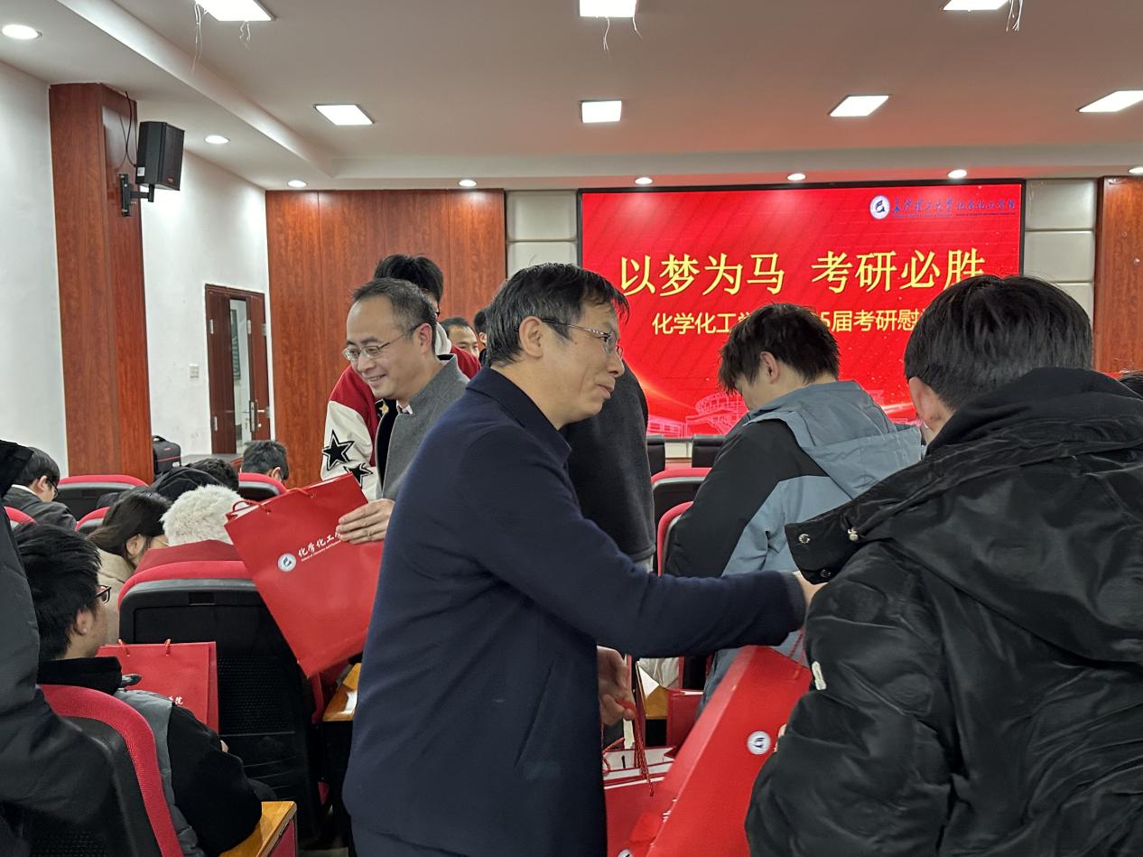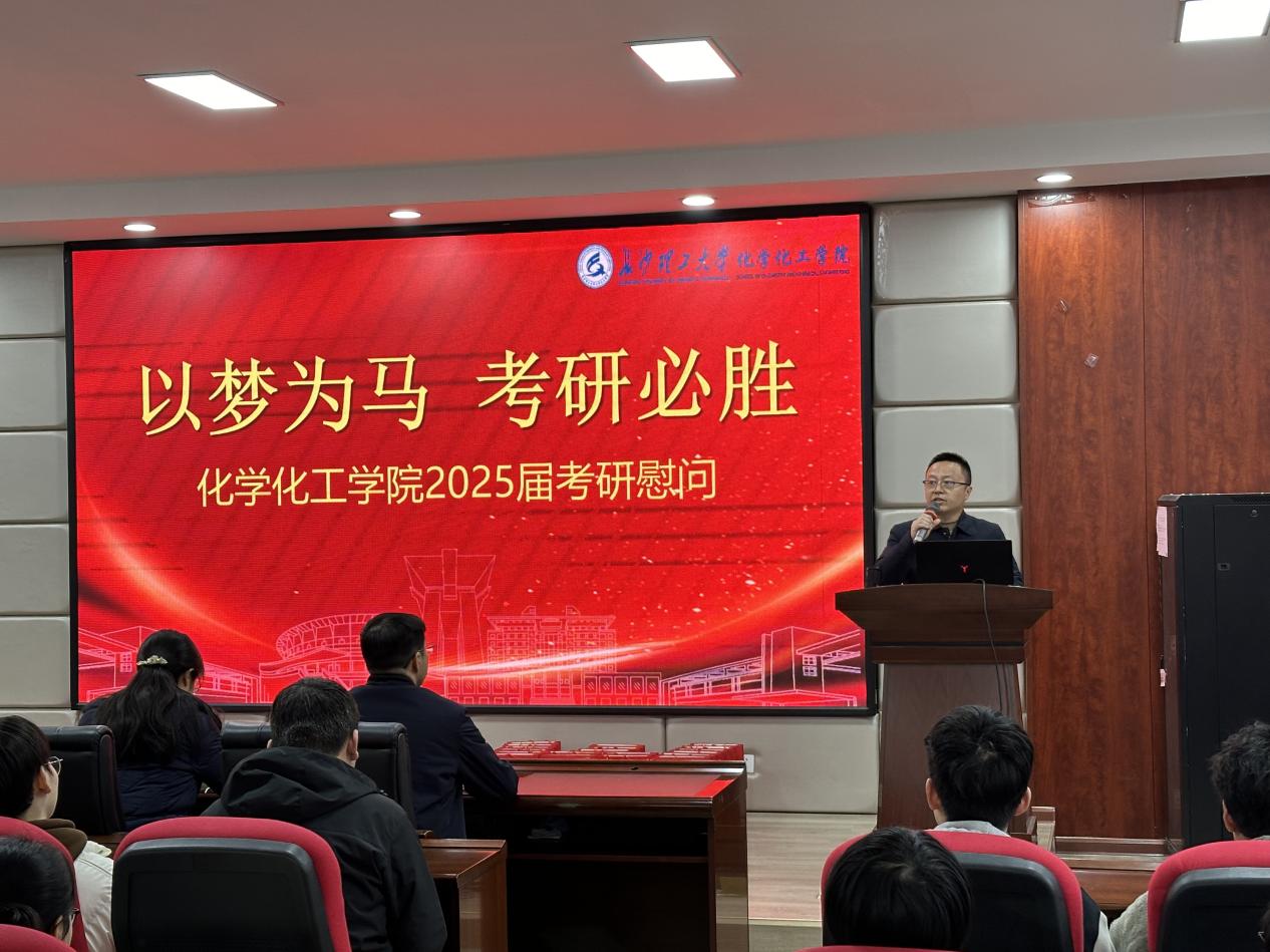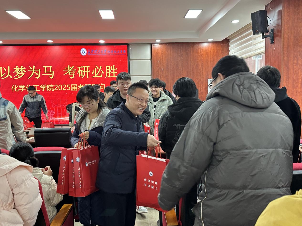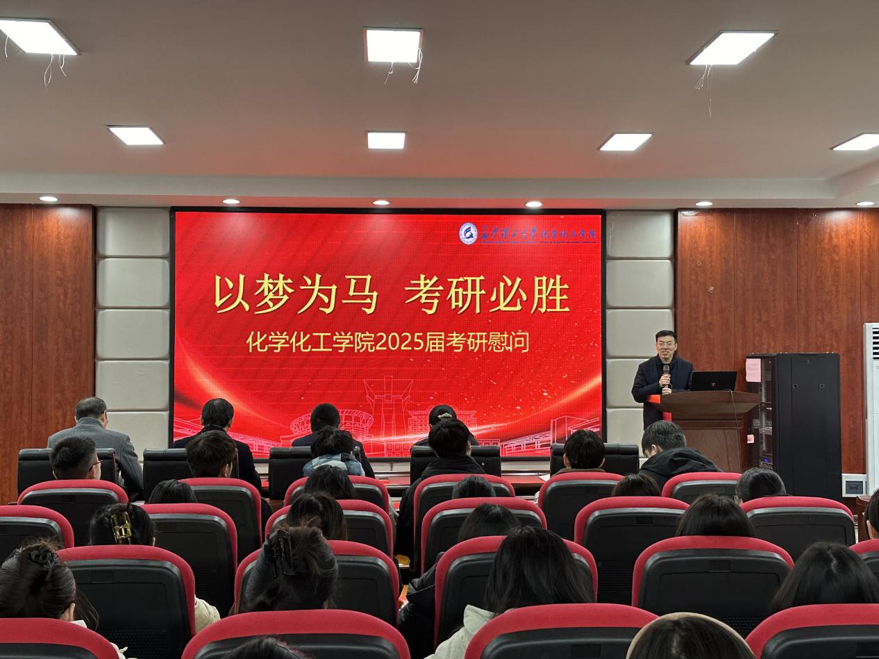 为进一步鼓舞考研学子的士气,传递学院对学子的关心与祝福,12月11日下午,长沙理工大学化学化工学院在工三A320室组织了“考研送祝福”活动。活动旨在为即将参加2024年研究生入学考试的考生们加油助力,帮助他们缓解备考压力,激发他们的信心与勇气。学院全体院领导、辅导员和考研同学参加了此次活动,活动由学院党委副书记李家春主持。