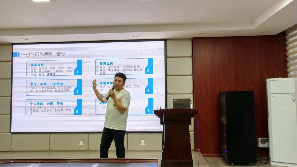 5月10日晚,为了帮助即将迎来求职季的2022届毕业生增进对简历制作的了解,提前准备好简历寻找实习岗位,化学与食品工程学院简历制作专题讲座于今天晚上在工课三号楼A320报告厅举行。由学院就业专干老师兰贵辉主讲,共计六十余名大三及研二学生主动参与。