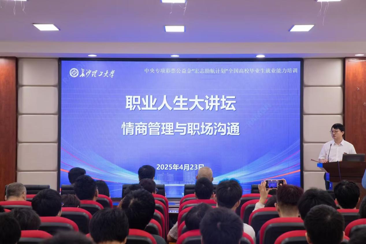 2025年4月23日,长沙理工大学成功举办了中央专项彩票公益金“宏志助航计划”全国高校毕业生就业能力培训之职业人生大讲坛。本次活动以“情商管理与职场沟通”为主题,特邀湖南省镭目科技股份有限公司董事长田陆先生担任主讲嘉宾,线上直播与线下主讲同步进行,吸引了近1500名师生参与,旨在通过实战经验分享,助力毕业生提升职场竞争力,迎接职业挑战。
