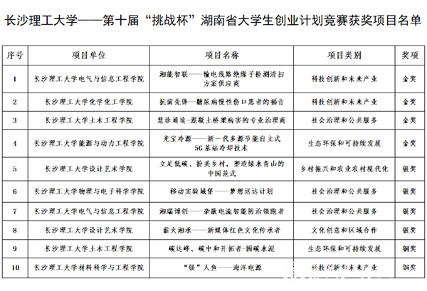 “挑战杯”大学生创业计划竞赛是具有导向性、示范性、实践性和群众性的高校权威赛事,是共青团组织服务青年师生健康成长成才的传统品牌工作。今年,省内共有15293个项目报名参赛,覆盖全省高校青年师生超过20万人次,104所高校的667个项目入围终审决赛,参赛高校和参赛项目均创历史新高。雷竞技官网电气与信息工程学院《湘能智联——输电线路绝缘子检测清扫方案供应商》、化学化工学院《抗菌先锋——糖尿病慢性伤口患者的福音》、土木工程学院《慧诊通途——混凝土桥梁病害的专业治理商》和能源与动力工程学院《光宝冷源——新一代多源节能自主式5G基站冷却技术》4个项目荣获省赛金奖,《立足低碳、扮美乡村,塑造绿水青山的中国范式》等4个项目获省赛银奖,《“镁”人鱼——海洋电源》等2个项目获省赛铜奖。
