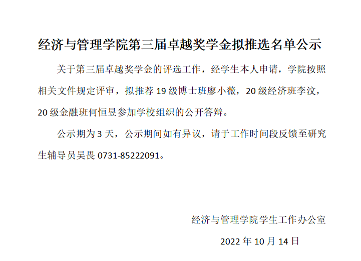 经济与管理学院第三届卓越奖学金拟推选名单公示