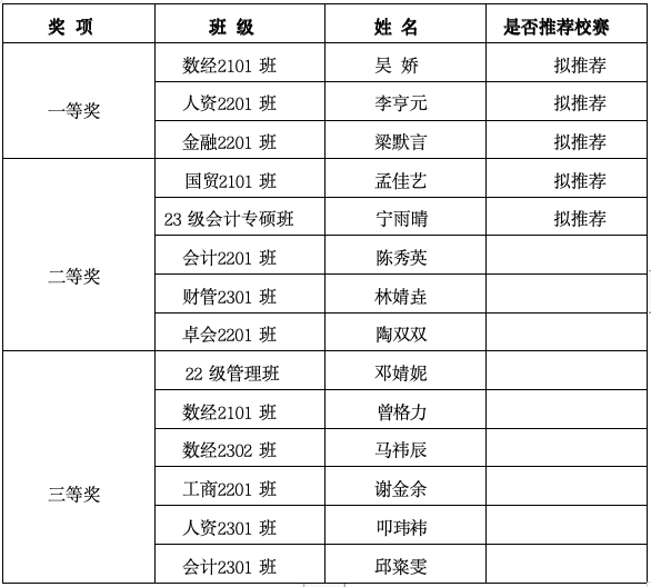 根据《教育部关于举办首届全国大学生职业规划大赛的通知》(教学函〔2023〕1 号)和《“ 中交杯 ”长沙理工大学第十一届职业生涯 规划大赛暨首届全国大学生职业规划大赛校级选拔赛的通知》相关工作要求,通过线下答辩、学院材料审核、学院评选指标设立等方面综 合考虑,现将长沙理工大学第十一届职业生涯规划大赛经管学院选拔赛拟推荐校赛名单和获奖名单公示如下:
