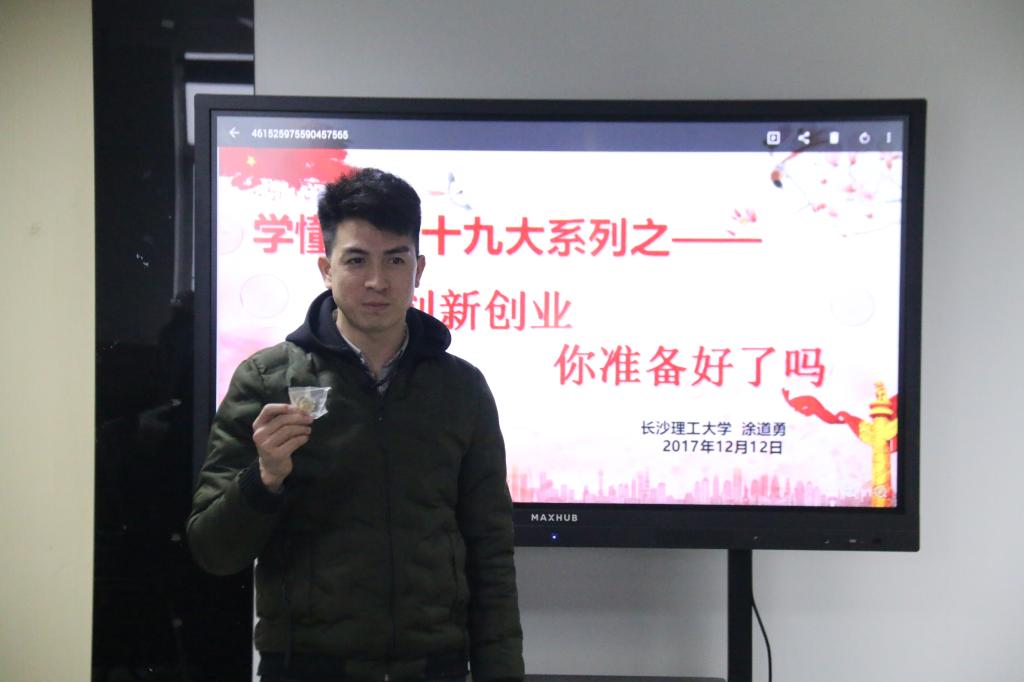 涂道勇围绕党的十九大报告进行讲话,讲到国家主席习近平在教育方面主张教育优先发展战略,并且提出了新的五大发展理念。并由此延伸到校友阿迪力,要坚定信念,开启思路,主动和了解关心国家相关的扶持政策,勇于实现自己的创业梦。同时也要积极了解国家对于青年创业的相关政策,将党的十九大精神落实到行动中来。