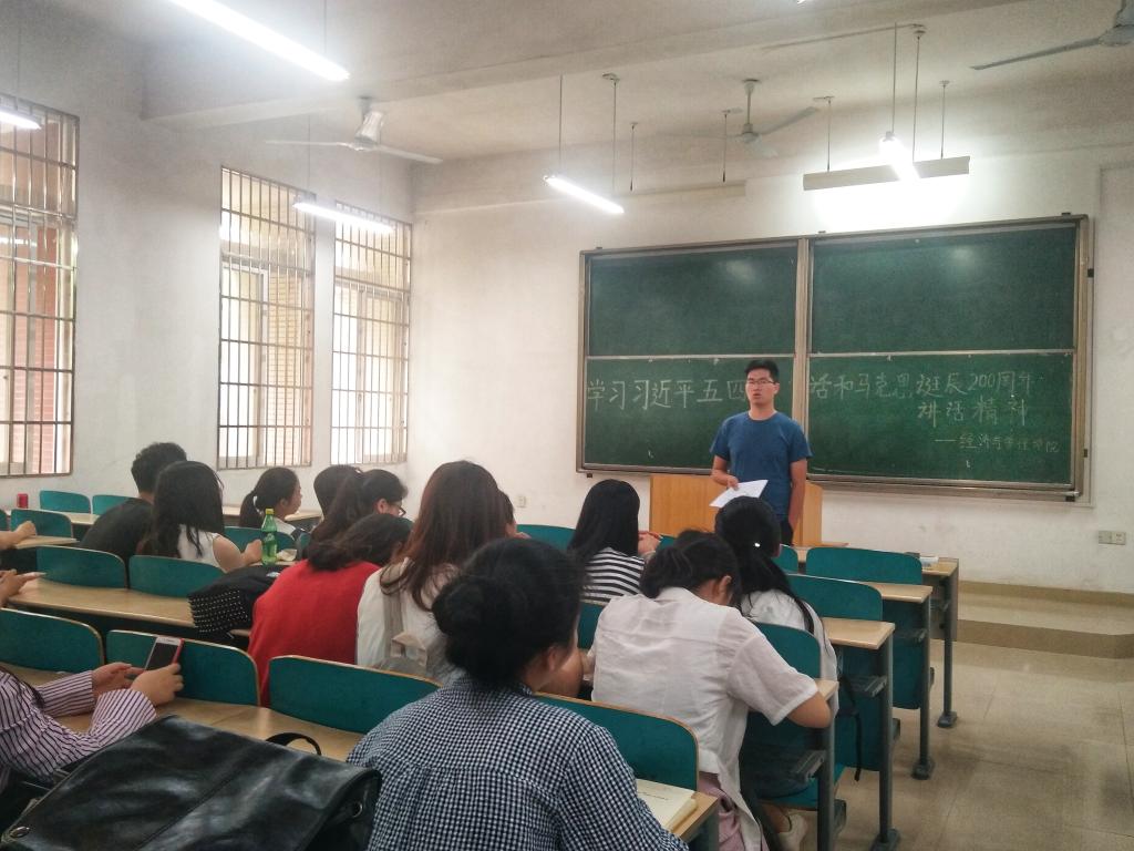 5月4日中午,经管学院在文科楼E101集中学习习近平五四讲话和马克思诞辰200周年讲话精神,参加此次学习的有学院学生党建辅导员王宝宝、学生党员和积极分子代表。