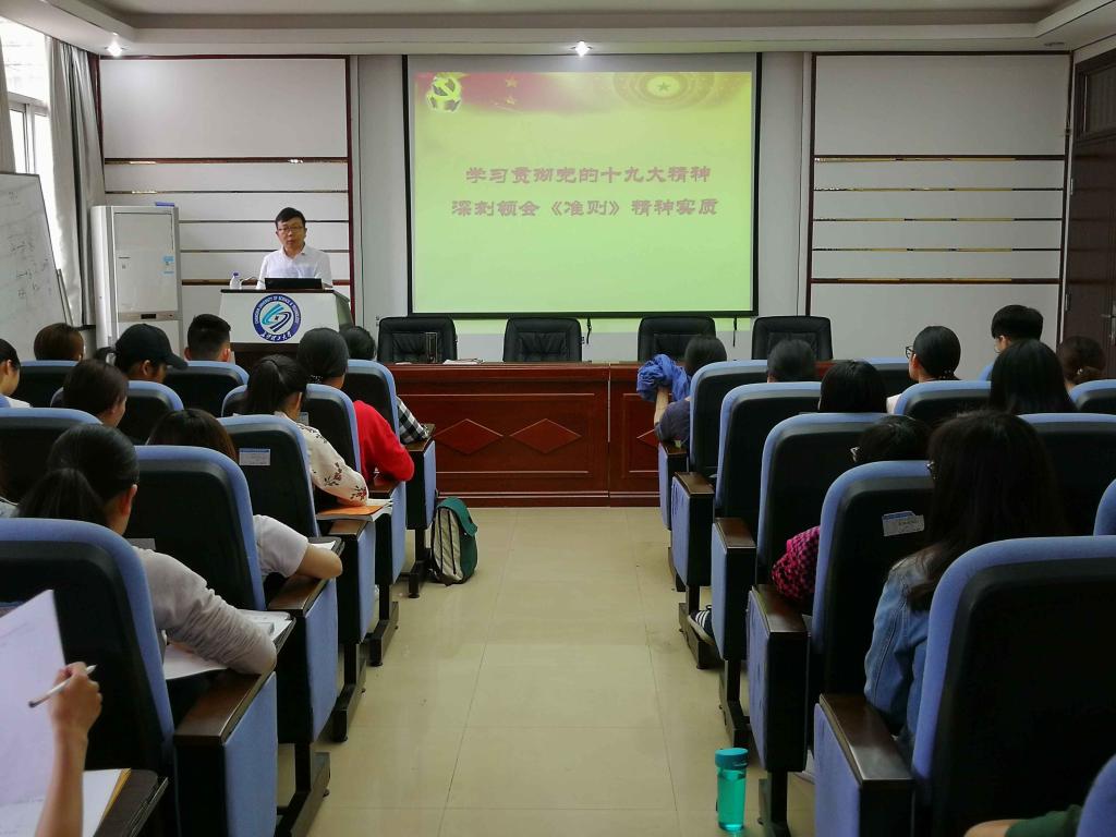 涂道勇书记的课程名为《党内政治生活的若干规定》。正式上课前,涂道勇首先对学院推优入党工作细则进行了简要阐述,并鼓励大家为《细则》的完善建言献策。接着,他从党的十九大对新时代的从严治党提出新要求、制定《新准则》的必要性、《准则》五个方面的鲜明特点、多位中央领导有关《准则》的说明以及《准则》主要内容等方面展开,结合党内的实际情况,用其独特的授课方式,从十二个层面向同学们详细地解读了《新准则》。最后,他强调“希望大家能怀揣一颗奉献的心,从严要求自己”。