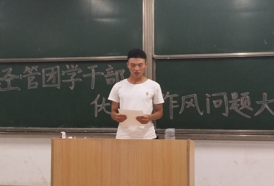讨论开始之前,院团委副书记曾婵婧先跟同学们讲述了成都某校学生会发生的官僚做派、不良风气事件,并组织同学们围绕当前经管学院学生干部的问题和针对学生干部不良风气的解决方法展开了15分钟的讨论。随后,以两部门为一个单位,排出代表上台总结发言。办公室和资助部就职称问题和各部门之间的沟通问题提出建议,即以“学长学姐”代替“主席部长”的称呼和多组织团学活动以增强凝聚力。组织部和青志协则提出明确工作界限,不把工作上的严厉态度带到生活中,并要认识到学生会是为人民服务的平台。设计部和公关部就团学干部不干实事和缺乏积极性问题,提出了任务轮流制的解决办法。以及其他部门针对团学中存在的以权谋私、缺乏时间意识、缺乏系统培训开展培训分工和素质拓展等问题,都一一提出了解决方案,要求同学们不忘初心、以身作则。讨论过后,主席周彬宣读了《学生会、研究生会干部自律公约》倡议。