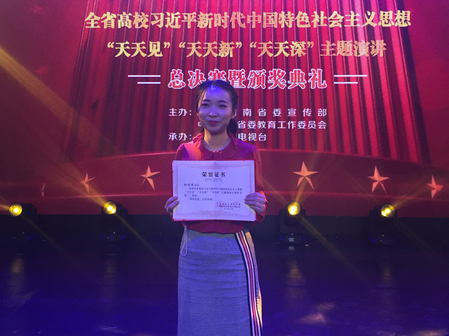 此次主题演讲比赛由中共湖南省委宣传部与中共湖南省委教育工作委员会主办,湖南教育电视台承办。杜逢清同学通过讲述全国优秀大学生、长沙理工大学邹勇松的先进事迹展示了生命的力量,揭示并回应了习近平总书记对青年朋友的时代号召,鼓舞青年朋友们不忘初心、牢记使命,做时代的弄潮儿,做创新的先锋,做学习的勇者。经过激烈角逐杜逢清最终在11名选手中以91.42的高分获得一等奖。