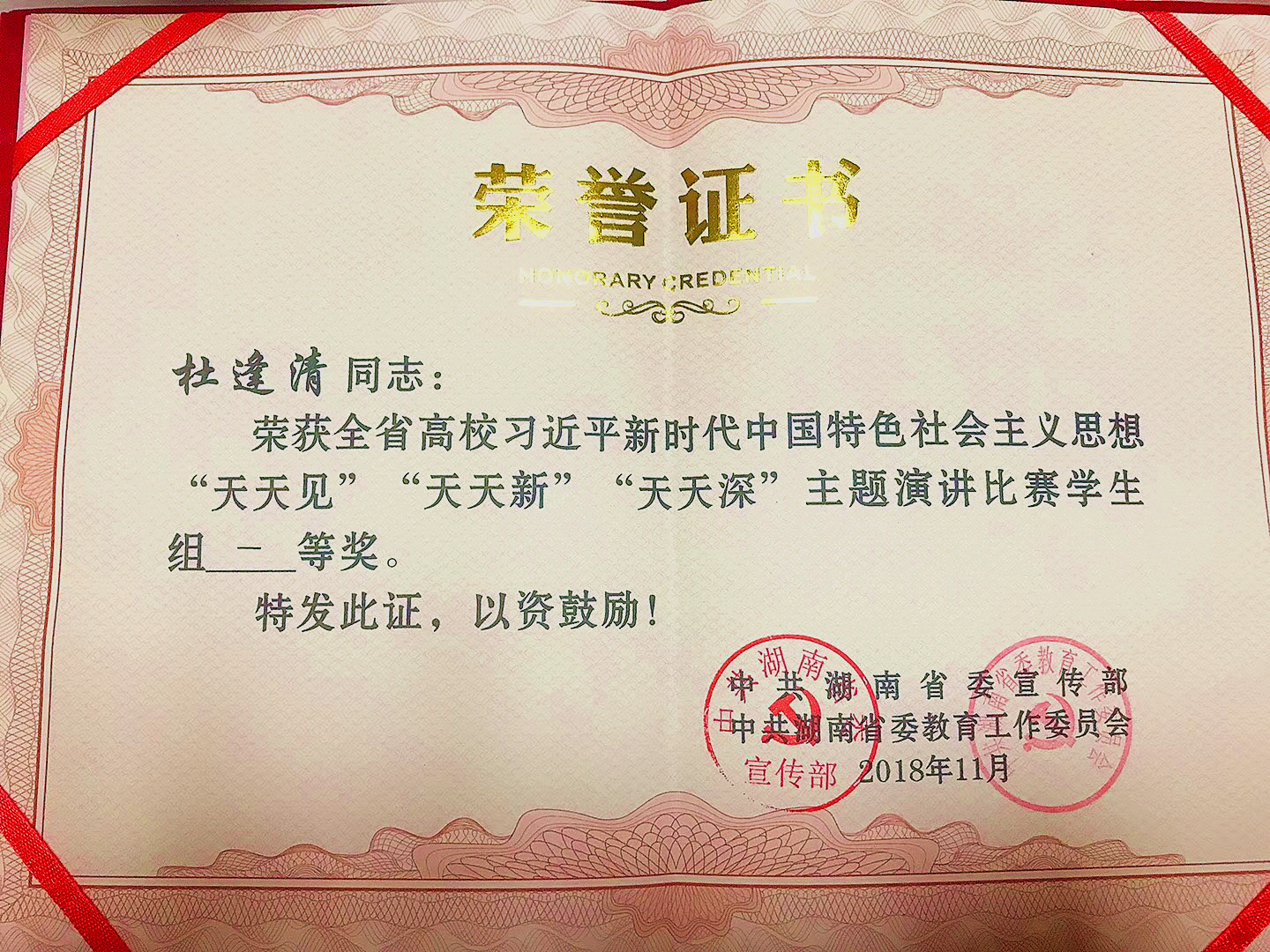 11月23日下午,湖南省高校习近平新时代中国特色社会主义思想“天天见”“天天新”“天天深”主题演讲比赛决赛在湖南教育电视台隆重举行,经管学院财务管理1603班杜逢清同学表现突出喜获学生组一等奖。