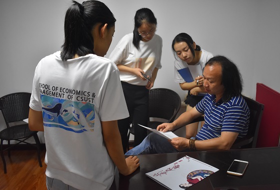 在与刘馆长的访谈中,他着重指出了,目前岳州扇厂商销售前景良好,但传统手工艺传承者之间矛盾突出,且后续传承力量不足,如何解决这两大问题将是接下来工作的重心。谈及岳州扇的发展历史,刘馆长拿出几把孔明扇和斑竹扇供队员们进行对比,使队员们对岳州扇及其技艺有直观的印象及认识。临走前,他还将这几把富有特色的岳州扇赠送给了队员以做纪念。