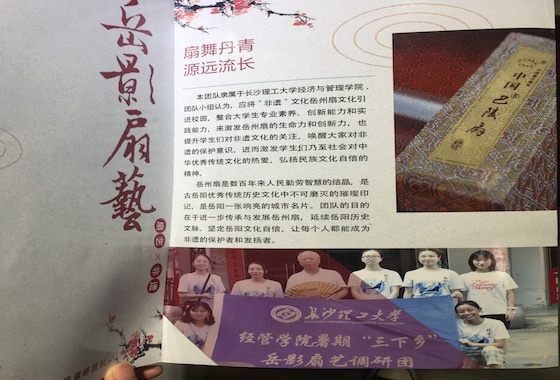 团队负责人曾丹玲说:“通过这为期一周的岳阳调研走访,团队真正感受到了作为全国三大名扇的岳州扇的独特魅力,它是湖湘文化的有力载体和文化寄托。同时也认识到了岳州扇在传承中与进一步发展中存在的重大问题,希望能通过大家的努力和思考,在保持岳州扇特色基础上,加强视觉化设计,整合当地政府资源,让岳州扇有更好的传承和发展,让越来越多的人发寻它的美,期待它进一步的发扬光大!”