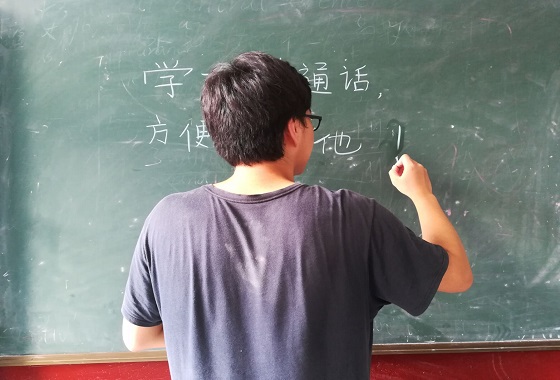 在讲解书写标准之后,支教成员让有意愿的学生用标准的普通话说出自己的名字,并写在黑板上。支教团成员则对每一位学生的书写错误进行纠正,规范正确的书写形式。随后,支教成员带领学生们先后诵读了《陋室铭》、《蒹葭》、《关雎》等文言诗词,为明天诵读会的顺利开展做充分准备。诗词诵读潜移默化地影响着学生们的思想,极大地激发了学生们对中华经典文化的热情和敬畏。同时,这也促使学生们尽早养成讲普通话的习惯。