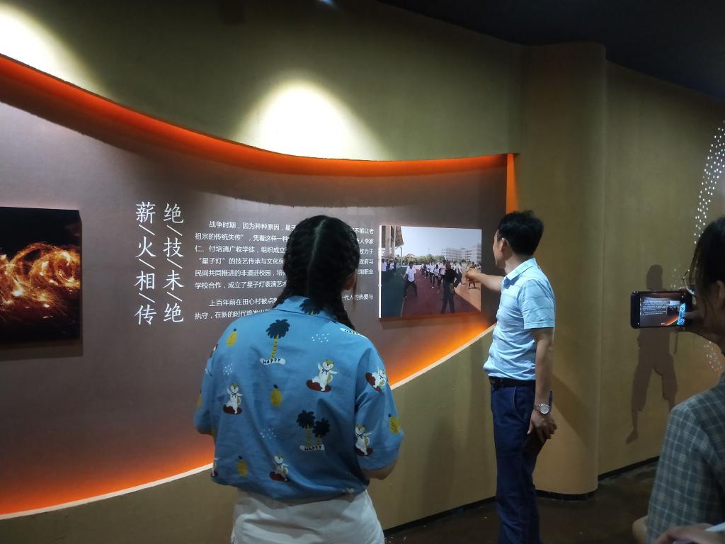 星子灯,是流传于湖南省醴陵市境内的一种传统民俗舞蹈艺术形式。因其用硝、硫磺等物制作而成,点燃后,火星四溅,明亮闪烁,有如天上的繁星,故名为“星子灯”。为了让团队成员对星子灯文化有更深刻的了解,在抵达田心村的当天,第五代传承人——张辉书记带团队成员参观了田心村的非遗展厅,对星子灯表演道具、舞蹈形式、发展历程进行了详细的介绍。