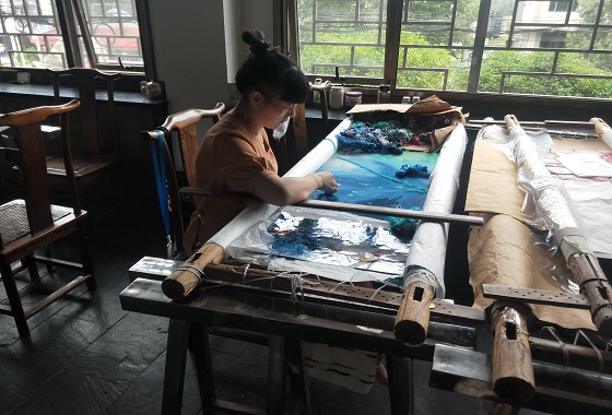 沙坪湘绣文化广场在开福区政府、捞刀河镇政府、长沙市湘绣协会的共同支持下建立。在参观中,调研团成员发现,湘绣绣艺早期的传承方式是母女、姊妹、姑嫂家庭式传授。新中国成立后,湘绣逐渐走向产业化,但培训仅停留于美术知识与刺绣技艺的培训传承。相关政府也逐渐认识到画艺和绣艺人才培训的重要性,在各大专业大专学校增设了各种形式的画艺与绣艺培训,为湘绣产业的持续发展提供了有力保障。