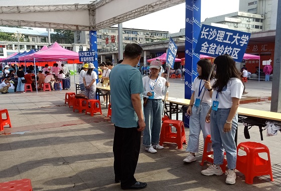在迎新过程中,我院志愿者们高举“长沙理工大学”的引导牌,站在火车站出口前等待学校新生,并有序引导新生及家长乘车前往学校。车站外的迎新接待点内,志愿者们为前来咨询的新生及家长递上茶水,热情地与他们进行交流,耐心地解答他们的疑问,力求为新生们提供最好的服务。