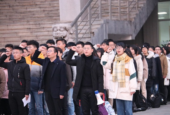 国旗班的旗手迈着整齐划一的步伐,护五星红旗入场。伴随着国旗缓缓升起,全体师生高唱国歌。随后,全体同学高举右拳,在国旗下进行庄严宣誓,精神昂扬,声音洪亮。升旗仪式结束后,学生代表雷启明进行国旗下的讲话,他结合自己的亲身经历与感受,阐述了作为一名新时代大学生的责任与担当,呼吁同学们应当有理想有抱负,为理想奋斗,勇做时代弄潮儿。最后,何涛对于此次升旗仪式的到场率及学生的状态提出表扬,并就学风建设、养成教育和安全教育等几方面对同学们进行了指导分析,强调同学们要按时、认真上课,安排好期末复习,诚信应考,杜绝作弊行为。生活中要养成良好习惯,时刻保持寝室内务卫生、不使用违规电器,维护好人身财产安全,同时也要关爱身边同学。