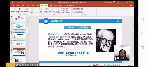 本次培训借助腾讯会议软件,结合PPT讲解和小视频播放的形式开展。首先,李丽兰简要介绍了国内和国际疫情走势,询问大家在家学习与生活的近况,这也使得培训氛围立马变动轻松、愉悦了起来。通过线上共享课件的方式,李丽兰从三个方面开展知识培训。培训的第一部分为“朋辈需掌握的防疫知识”,从卫生防疫知识和心理防疫知识两方面展开,重点讲解了心理防疫中情绪的自我觉察与接纳。紧接着指导学生负性情绪适调的方法与途径。结合事例与现场互动练习,李丽兰为学生介绍了情绪ABC理论的原理与操作方法,让大家真切体会到“转念之间,心情就开心了”的奇妙感。培训第三部分则介绍了疫情下的朋辈互助工作,指导朋辈心理互助员如何关注因疫情等压力产生心理困扰的同学,积极组织、参与班级线上健心活动,做一个好的倾听者、支持者、陪伴者。最后,李老师为大家介绍了书籍、电影、微信公众号、心理咨询等心理援助资源,方便大家必要的时候主动求助。课程讲解结束后,李老师带领大家在评论区里,积极写培训小结与感悟,强化培训效果,营造健康、积极、向上、互助的良好氛围。