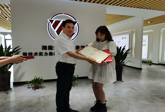 颁奖仪式结束后,由学生获奖代表张传红发言。他讲述了在大学期间的学习经历,明白了青春是用来奋斗的这一真理,对学校的教育与培养以及湘能楚天的支持表达了诚挚的谢意,也表示了对班主任以及全班各位同学为班级奋斗、无私奉献的感谢。