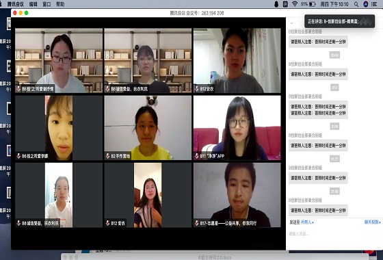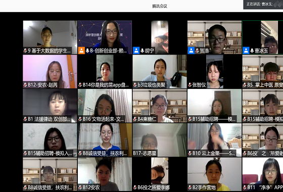 此次答辩通过腾讯会议在线上进行,共有34个团队参加,其中包括30个主体赛道团队,4个为青年红色之旅赛道。答辩分为A、B两个会议室同时进行,每个会议室分别有17个团队,近200余人参与观赛。