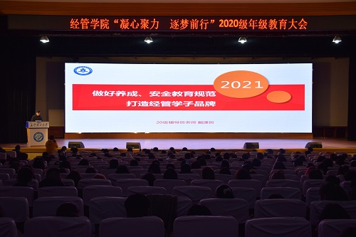 12月31日中午,经管学院“凝心聚力,逐梦前行”2020级年级教育大会在金盆岭校区五教大礼堂顺利展开。经管学院党委副书记唐青、2020级辅导员李丽兰、戴逢哲及2020级全体学生参加了大会。