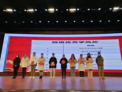 大会由2020级新生李品彦同学主持。会议开始,播放了经管学院2020级新生风采展示视频,回顾了入学至今的难忘时光。随后,学生代表ACCA2002班邓涵钰同学发言,她分享了学好高数的方法和进入民兵连的体会,其励志精神鼓舞了现场每位同学。接着2020级辅导员李丽兰和戴逢哲分别发言。李丽兰从军训场、比赛场、班级风采展示、学习活动、日常生活五个方面向大家展示了“不抛弃”的团队合作精神和“不放弃”的奋斗拼搏精神。她总结了2020级学风建设工作举措,强调了考风考纪教育与疫情防控安全教育的重要性。戴逢哲开展了养成教育指导,强调了内务卫生及预防诈骗教育与安全教育的重要性,要求同学们提高校园内外自身安全意识。谈到国防教育,他号召有志青年“携笔从戎,参军报国”,让自己的青春多一缕迷彩的颜色,并详细介绍了大学生参军入伍相关政策。随后是颁奖环节,2020级从内务养成教育、课程学业成绩、班级学风、早晚自习、学科竞赛等指标开展了评比活动,产生了文明寝室奖、单科学习标兵奖、班级优秀学风奖三大类奖项,由三位老师一一颁奖。紧接着,由唐青进行总结发言。她希望大家展望未来、脚踏实地,并提出了三点意见。第一点提出把个人理想融入到祖国建设的宏图中,“常思大局,其行有方”强调了高格局、高站位的重要性;第二点要重视学业,希望新生们能在期末考试中获得好成绩;第三点提出要把远大的理想落实落细落小,一点一滴着手,小细节体现了良好的个人品质与精神风范。会议最后,在喜庆的“新年快乐”音乐声中,三位老师为每个班级赠送新年小礼物并合影留念。