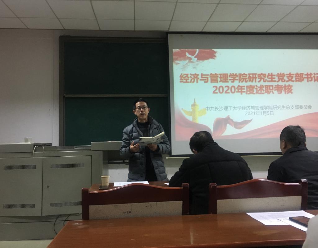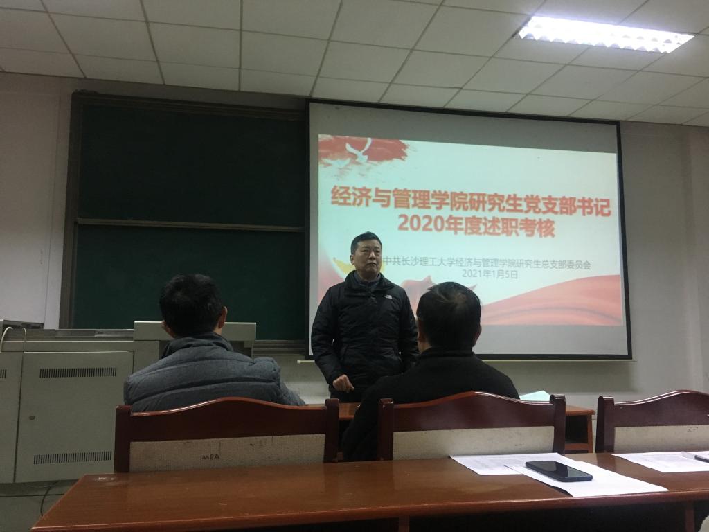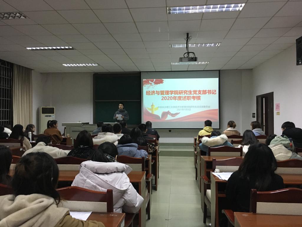 为更好地促进基层党组织书记履职尽责,推动管党治党责任在基层落地落实,2021年1月5日晚7点,经济与管理学院研究生党总支于金盆岭校区7教110召开了党支部书记述职考核会议。院党委副书记唐青,专职组织员丁力,关工委特邀组织员陈均杰、李争流,学生党总支副书记、研究生辅导员周路路,党建辅导员叶鑫和全体党支部书记参加了本次会议,会议由研究生党总支委员陈实主持。