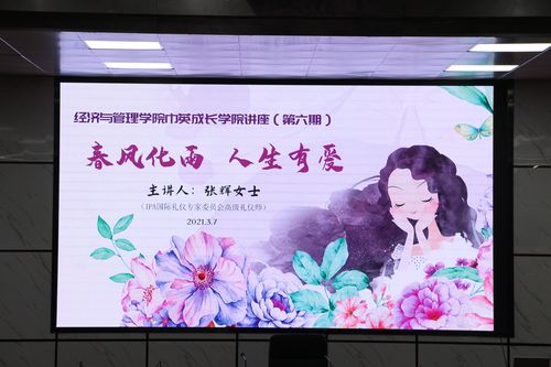 3月7日上午,经管学院巾英成长学院第六期讲座在金盆岭校区四教一楼报告厅顺利开讲。讲座主题为“春风化雨,人生有爱”,主讲嘉宾为IPA国际礼仪专家委员会高级礼仪师张辉女士。学院党委副书记唐青、2020级辅导员李丽兰和戴逢哲老师、2020级女生代表参与了此次活动。