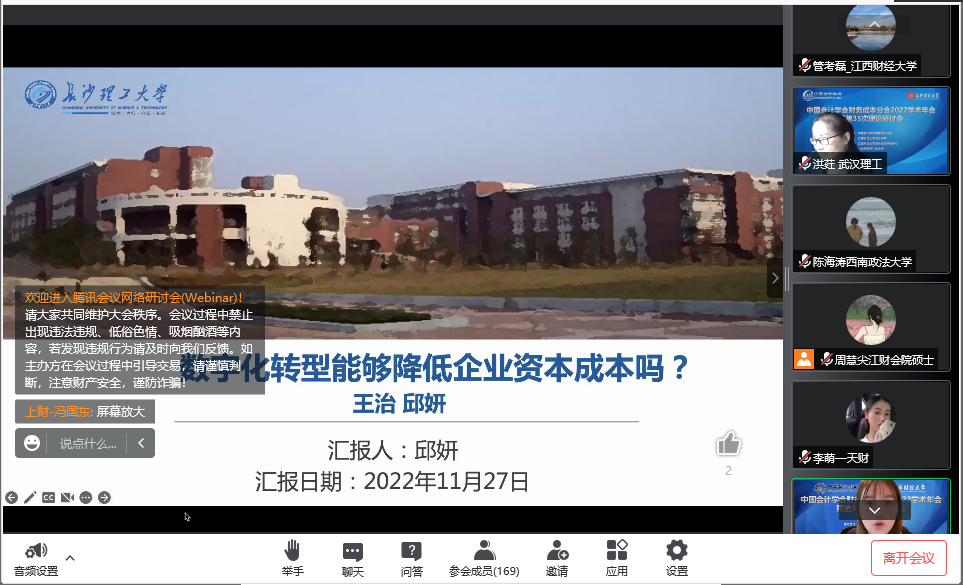 2022年11月26日-27日,由中国会计学会财务成本分会主办、江西财经大学会计学院承办、江西财经大学会计发展研究中心、《当代财经》杂志社协办的中国会计学会财务成本分会2022学术年会暨第35次理论研讨会在江西财经大学线上举行。复旦大学吕长江教授、对外经济贸易大学陈德球教授、美国东北大学John (Jianqiu) Bai副教授、上海财经大学讲席教授何贤杰在本次研讨会上分别作了主旨报告。本次研讨会分设公司治理、环境保护与社会责任、企业数字化转型、企业创新、技术与财务等多个分会场,来自全国各高校近千名财会专业师生线上聆听了报告。我院博士研究生邱妍受邀在企业数字化转型分论坛汇报了她与导师王治教授合作撰写的学术论文《数字化转型能够降低企业资本成本吗?》。