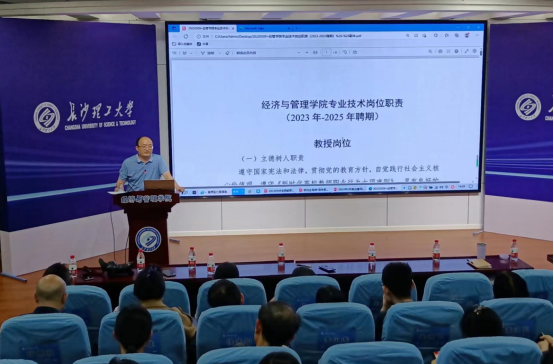 副院长(主持工作)彭新宇向全院教职工就上阶段学院工作进行小结,并就2023-2025年聘期专业技术岗位职责方案进行了解读。全院教职工对方案进行了表决,经现场统计,应到187人,实到157人,赞成156人,弃权1人,方案顺利通过。