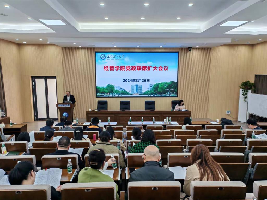 3月26日下午,经管学院在金盆岭校区经管大楼100报告厅召开党政联席(扩大)会议。学院班子成员,各教学系主任、副主任,各教工党支部书记、副书记及支部委员,各科室主任参加会议。会议由党委书记马丽主持。