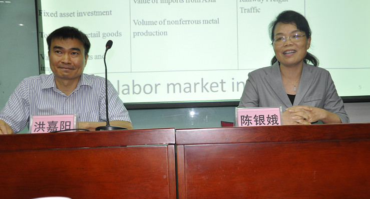 洪嘉阳教授首先阐述了描述一个经济体的周期要解决三个问题,一是有足够可获得的数据,二是确保数据的可靠性,三是结论的稳健性。洪教授从这三个问题的解决入手,选取了港口货运量、铁路运输量、客运量、电力供应量(月度数据)、以及市场提供给求职者岗位比例(季度数据),构建了一个混频模型,计算了中国经济景气指数,并对相关方法进行了稳健性检验,证明了研究结论的可靠性。洪教授的报告深入浅出,诙谐生动,尤其对构建分析模型及指标的选取提供了新的视角和思路。