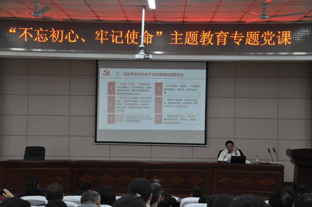 11月05日下午,经济与管理学院“不忘初心、牢记使命”主题教育专题党课在云塘校区文科楼A200举行。院主题教育领导小组组长、院党委书记王宏以“立德树人与大学文化建设”为主题,给学院全体教职工及学生党员代表讲了一堂生动的党课。