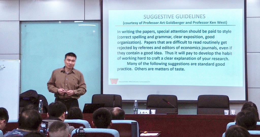 2019年12月17日下午3时,美国西密歇根大学经济学系洪嘉阳教授应我院邀请,在金盆岭校区7教212室,举行了题为“英文论文写作——以一篇工作论文为例”的学术讲座。讲座由学院副院长彭新宇主持,金融系主任尹筑嘉等老师、硕士博士研究生等一百余人参加了此次讲座。