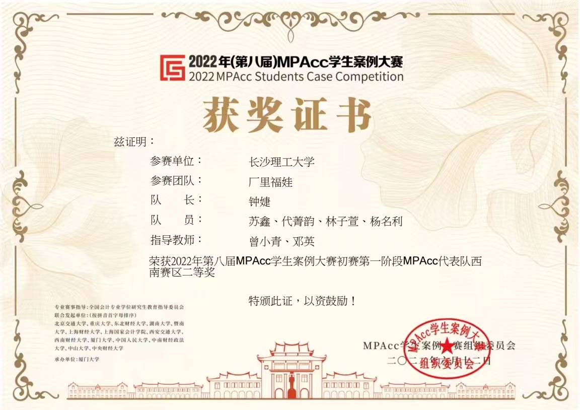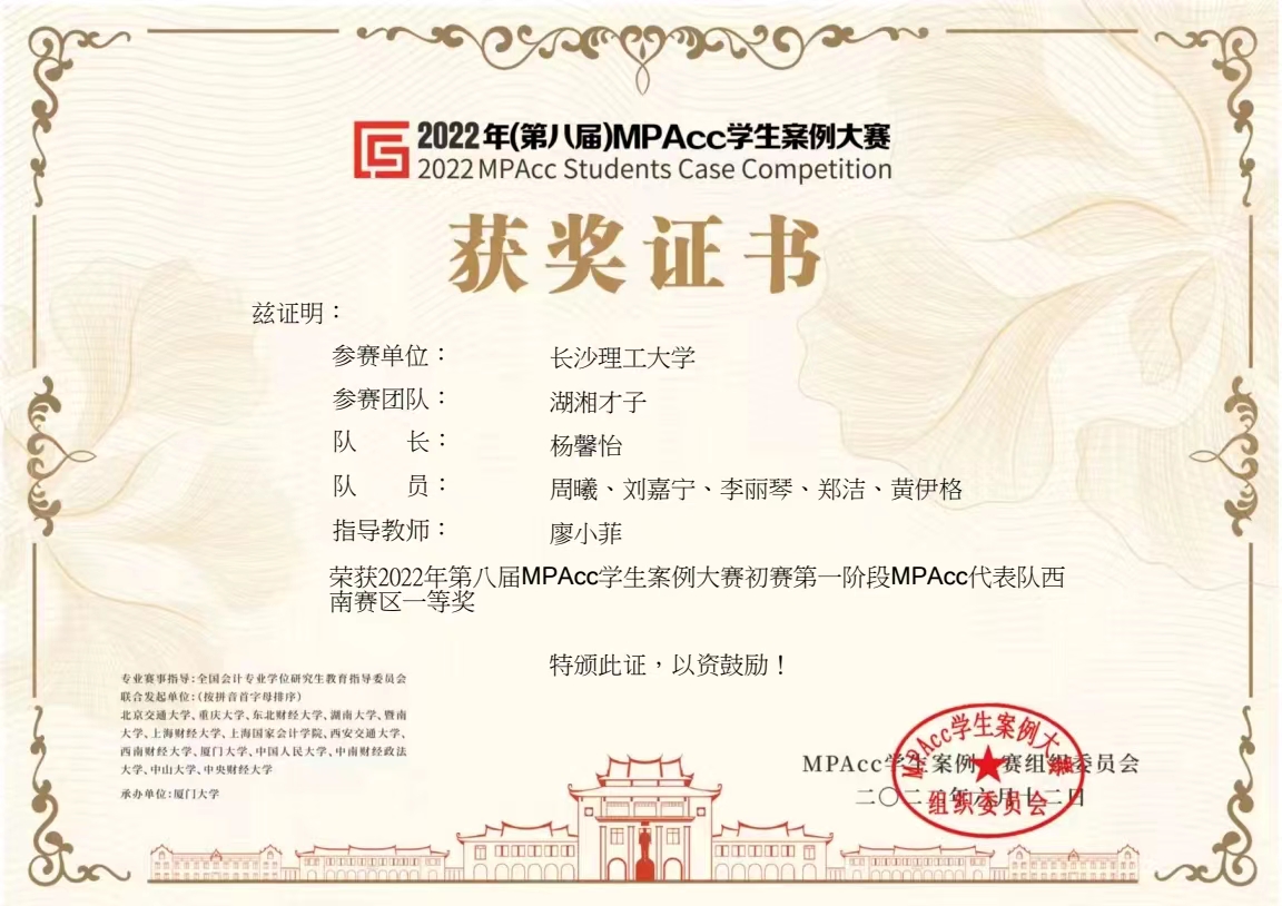 本次大赛西南赛区共535支队伍报名,长沙理工大学属于西南赛区参赛单位,学生们参赛踊跃,共有22支队伍报名。经过校内选拔, 8支队伍晋级参加国赛。最终,有两支队伍在初赛第一阶段中进入全国100强,分别是廖小菲老师指导的湖湘才子队(杨馨怡、刘嘉宁、郑洁、李丽琴、黄伊格、周曦)在西南赛区535支队伍中排名第二,获得初赛第一阶段西南赛区一等奖;曾小青、邓英老师指导的厂里福娃队(钟婕、代菁韵、林子萱、苏鑫、杨名利)在西南赛区535支队伍中排名第四,获得初赛第一阶段西南赛区二等奖。