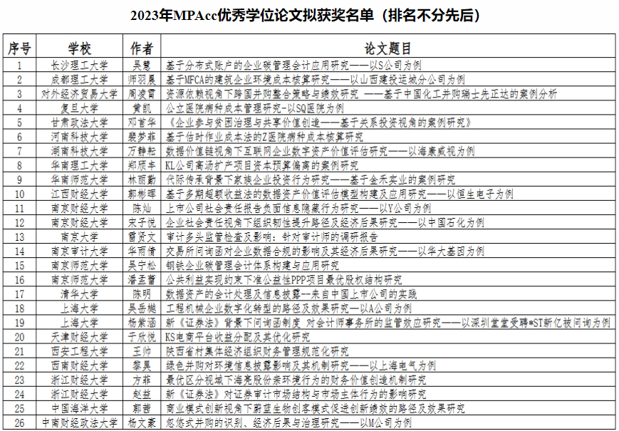学位论文是衡量研究生培养质量的重要标志。全国会计专业优秀学位论文评选工作由全国会计专业学位研究生教育指导委员会组织领导,每年组织一次,全国200多家培养单位每家提交1至2篇参选论文。雷竞技官网2023届会计专业硕士吴慧同学的学位论文从数百篇参选论文中脱颖而出,得益于学校高度重视专业硕士研究生人才培养模式改革,狠抓人才培养和学位论文质量,同时进一步扩大了雷竞技官网MPAcc教育的知名度和影响力。