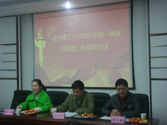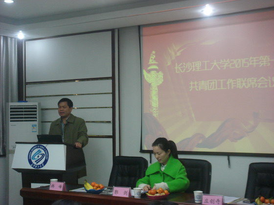 2015年1月9日上午9点在文科楼E501,由经济与管理学院分团委承办的,长沙理工大学2015年第一季度共青团工作联席会议顺利召开。出席此次会议的有湖南大学团委书记韩峰、经管学院党委书记庄创奇、党委副书记彭玉楼、各学院分团委书记以及各级学生组织代表。本次会议由校团委书记郭剑主持。 会议开始,首先是经管学院党委书记庄创奇致词,他代表经管学院对各学院新老团干前来传经送宝表示热烈的欢迎,随后以经管学院团学工作为切入点,提出了团干们的使命与责任。