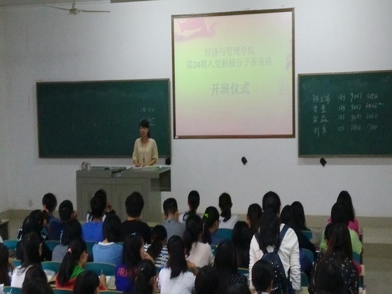 10月26号上午9:30到11:40,下午4:00到5:40,经管学院第24期入党积极分子党课开班仪式及第一堂党课在综合教学楼A203教室顺利开展,我院党委书记杨华峰、马克思主义学院刘保国与我院心理辅导员李丽兰出席。