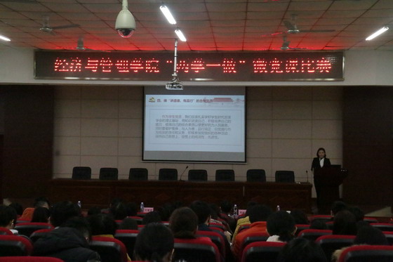 11月29日下午14:30,经济与管理学院“两学一做”微党课比赛于文科楼A200顺利举行。学院党委书记庄创奇、宣传部副部长邱国良、邓崛峰担任评委,学院党委副书记艾楚君、学工办老师、全体学生党员和2015级入党积极分子到场观看比赛。