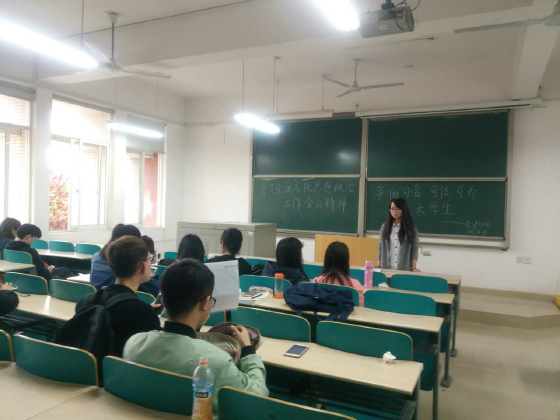 为深入学习贯彻全国高校思想政治工作会议精神,根据学生工作部(处)《关于组织召开学习全国高校思想政治工作会议精神学生主题班会的通知》要求,经管学院结合学院实际情况,2017年4月21日完成了在全院各班级召开“学习全国高校思想政治工作会议精神、争做可爱、可信、可为大学生”主题班会的工作。主题班会由班主任主持,下班党员和班级成员参加此次班会。