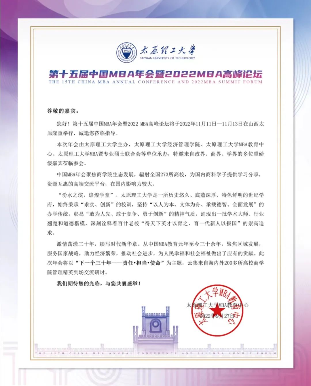 第十五届中国MBA年会暨2022 MBA高峰论坛将于2022年11月11日—11月13日在山西太原隆重举行,诚邀您莅临指导。