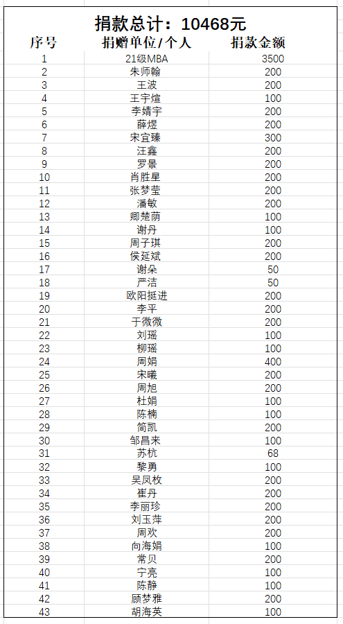 2023年4月27日,长沙理工大学经济与管理学院MBA学员为向丹同学捐款,捐款共募集10468元整。