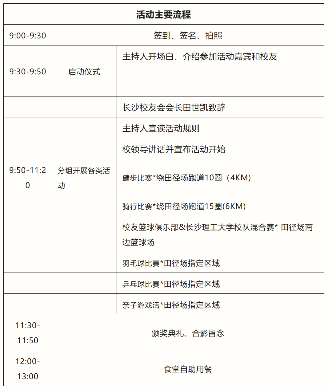 健步行活动(校内)由长沙校友会具体组织实施,于2023年5月20日上午9:00在长沙理工大学金盆岭校区田径场开始签到,随后开展健步行等体育娱乐活动。参与者可选择骑自行车、健步行、篮球、羽毛球、乒乓球、亲子游戏等活动。场地安排为: