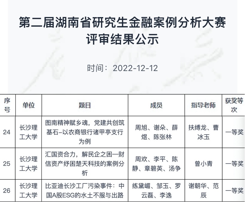 2022年12月12日,第二届湖南省研究生金融案例大赛组委会公布了2022年湖南省研究生金融案例分析大赛评选结果:雷竞技官网MBA学员在此次金融案例大赛中斩获佳绩,荣获一等奖。