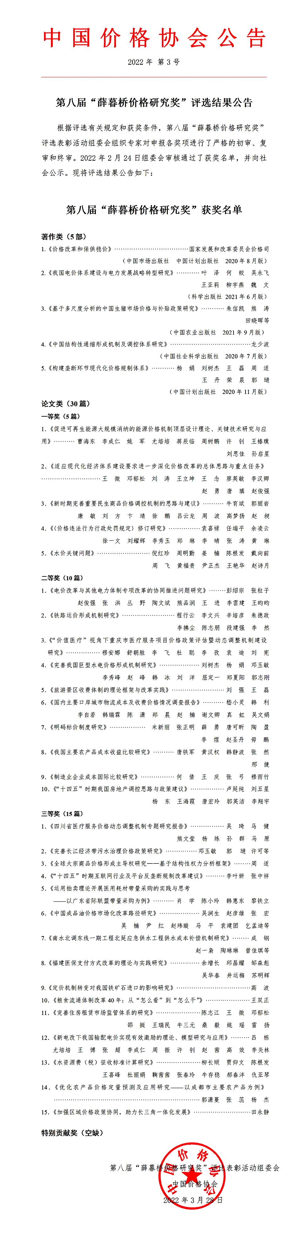 “薛暮桥价格研究奖”是经国家发展改革委等九部委审核确认,由国家发展改革委管理、中国价格协会主办的我国专门表彰价格研究成果的最高奖项,评选和表彰周期为三年。该奖项于1995年设立以来,得到了宋平、朱镕基、田纪云、李铁映、陈锦华、曾培炎、汪洋、马凯、张平、王春正等领导同志的关心和支持。该奖项由国家发展改革委及业内专家组成评选委员会对申报的论著进行认真评审,奖励对我国价格理论和价格政策研究有重要贡献的论著,其宗旨是弘扬薛暮桥同志理论联系实际的精神,在价格研究中营造严谨治学、求真务实和开拓进取的学术气氛,促进价格研究更好地为深化价格改革、提高价格管理水平和完善社会主义市场价格体制服务。