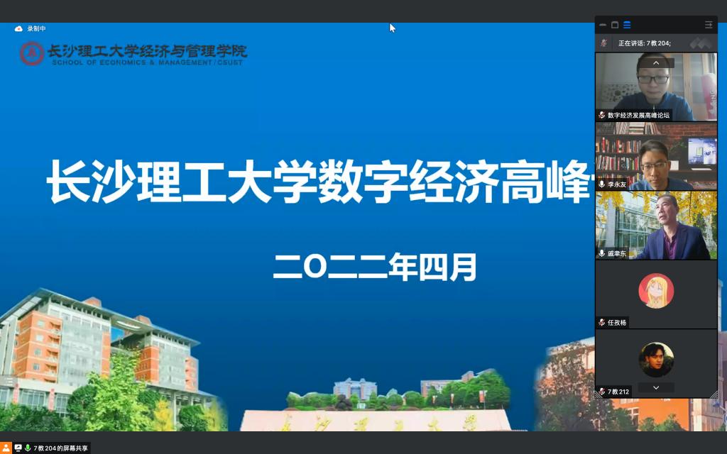 2022年4月17日上午9:00,长沙理工大学数字经济发展高峰论坛在金盆岭校区和线上同步召开。校党委副书记刘建民教授、学科规划处处长陈银娥教授,以及我院领导、部分教师和研究生100余人参加了本次数字经济发展高峰论坛。论坛由学院副院长彭新宇教授主持。