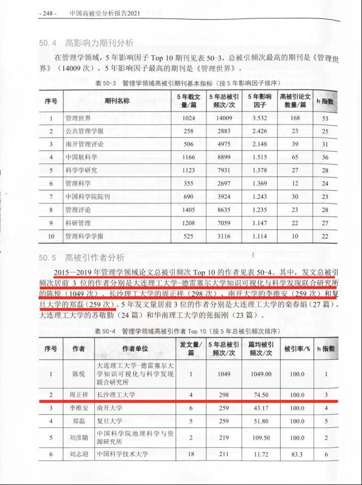 据《中国高被引分析报告2021》(曾建勋主编,中国科学技术信息研究所)报道:“2015-2019年管理学领域论文总被引频次Top10的作者见表50-4。其中发文总被引频次居前三位的作者分别是大连理工大学的陈悦(1049次)、长沙理工大学的周正祥(298次)、南开大学的李维安(259次)和复旦大学的郑磊(259次)。”我院周正祥教授发文总被引频次位居全国第二。