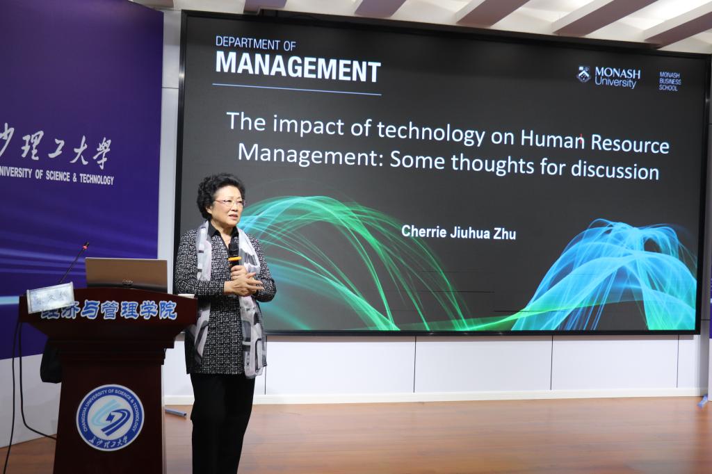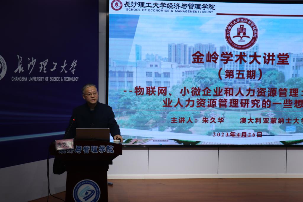 4月26日下午,经济与管理学院“金岭学术大讲堂”系列学术讲座第五期在金盆岭校区12教200举行。Chinese Management Studies(SSCI源刊)主编、澳大利亚Monash大学商业与经济学院教授朱久华受邀作了题为“物联网、小微企业和人力资源管理:对小微企业人力资源管理研究的一些思考”的学术报告。报告由企管系主任唐文彬教授主持,学院110余名师生参加了本次讲座。