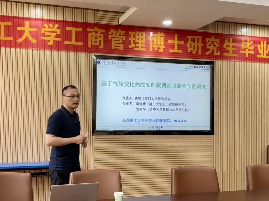 2024年4月19日,厦门大学管理学院中国能源政策研究院副教授龚旭在金盆岭校区7教204室为我院师生带来了一场以“基于气候关注度的碳期货收益率预测研究”为主题的学术讲座。讲座由经济与管理学院杨鑫老师主持,工商管理学、应用经济学以及金融学近20名师生参加。