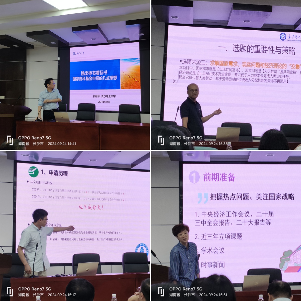 王治首先介绍了我院2024年国家基金立项情况,并指出这些成绩的取得是学校学院有效组织和老师们勤奋钻研的结果。接着,获2024年国家基金立项资助的教师代表张新华、胡尊国、刘新恒、谢斯曼分别就项目的选题、申报书的撰写以及谋篇布局等内容同与会教师分享了国家基金申报的心得体会。刘建江以《天堂与地域之间:参与式服务有困局》为题,就基金申报如何走出迷茫困局与大家进行了分享。与会教师都表示受益匪浅。