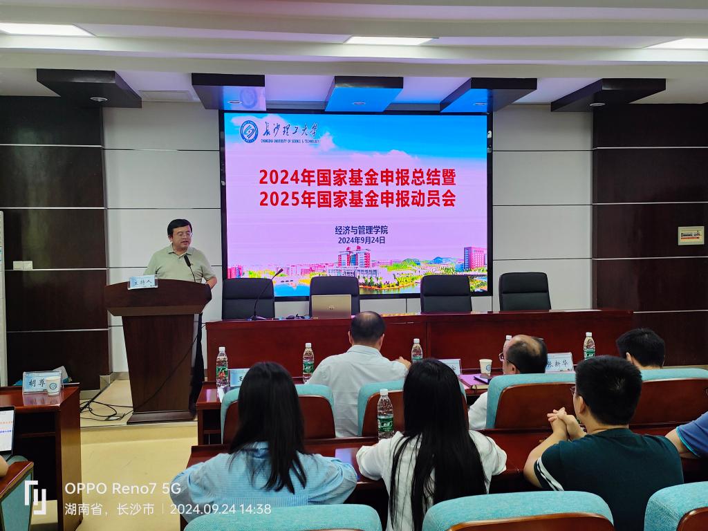 2024年9月24日下午,学院在金盆岭校区7教学楼212会议室召开2024年国家基金申报总结暨2025年国家基金申报动员大会。经管学院院长彭新宇、计财处处长刘建江、副院长王治、副院长何昊、获2024年国家基金立项资助的学院教师代表以及拟申报2025年国家基金项目的教师60余人参加了会议。会议由副院长王治主持。